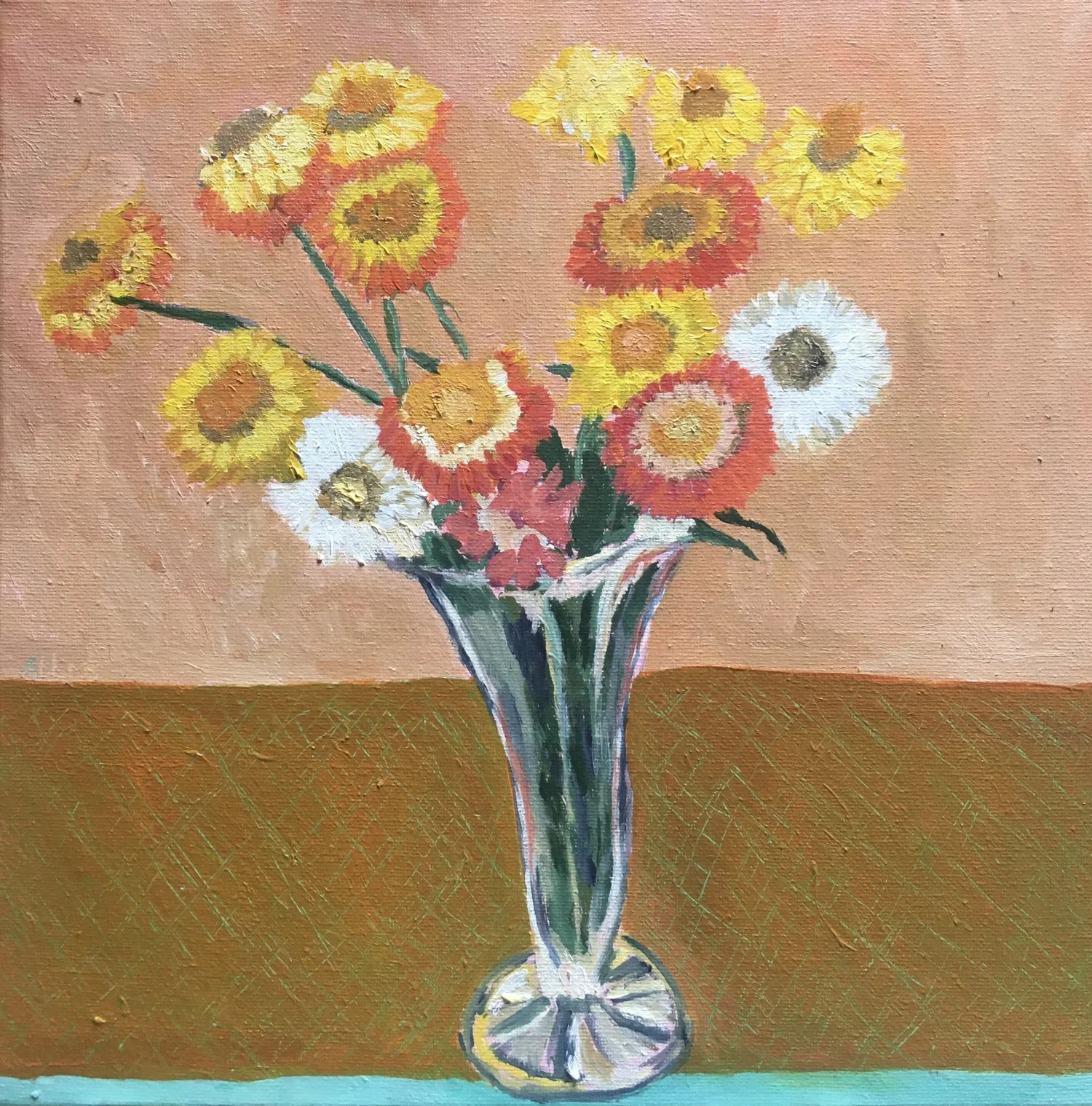 Coloured Paper Daisies, 31cm x 31cm, Oil on Canvas, 2020